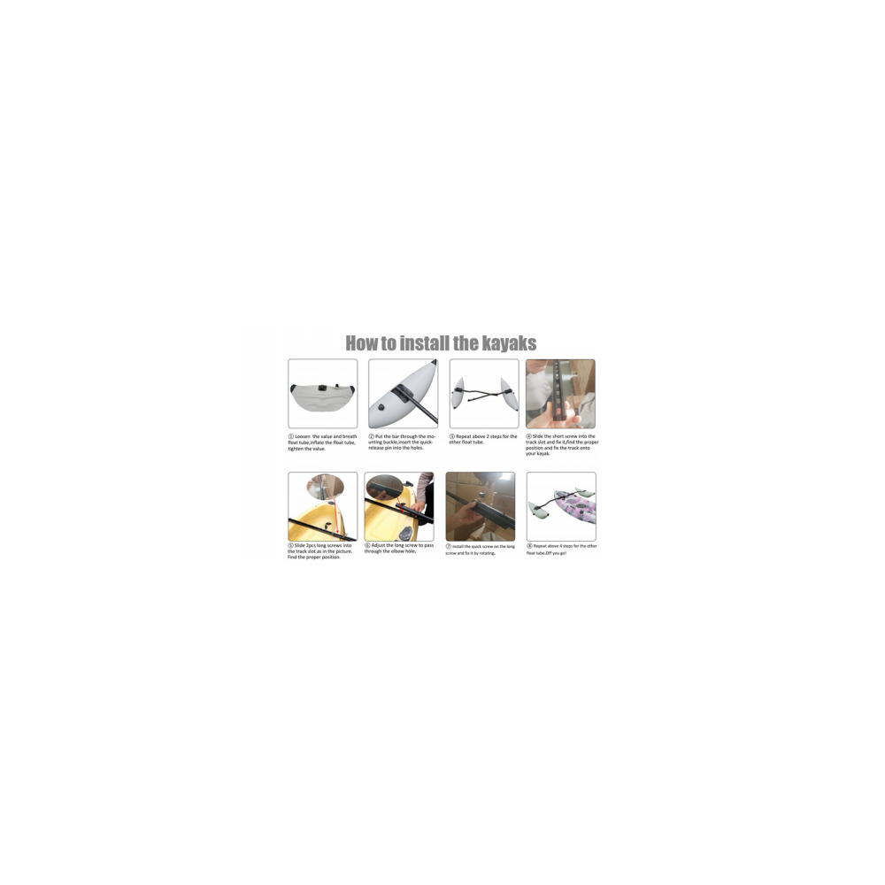 Mūsu komplektā ietilpst 2 x piepūšamie balsti; 1 pāris sānu balstu; 1 komplekts stiprinājumu, visas detaļas ir gatavas jums, radot stabilu un drošu peldspēju ūdens sporta veidos.